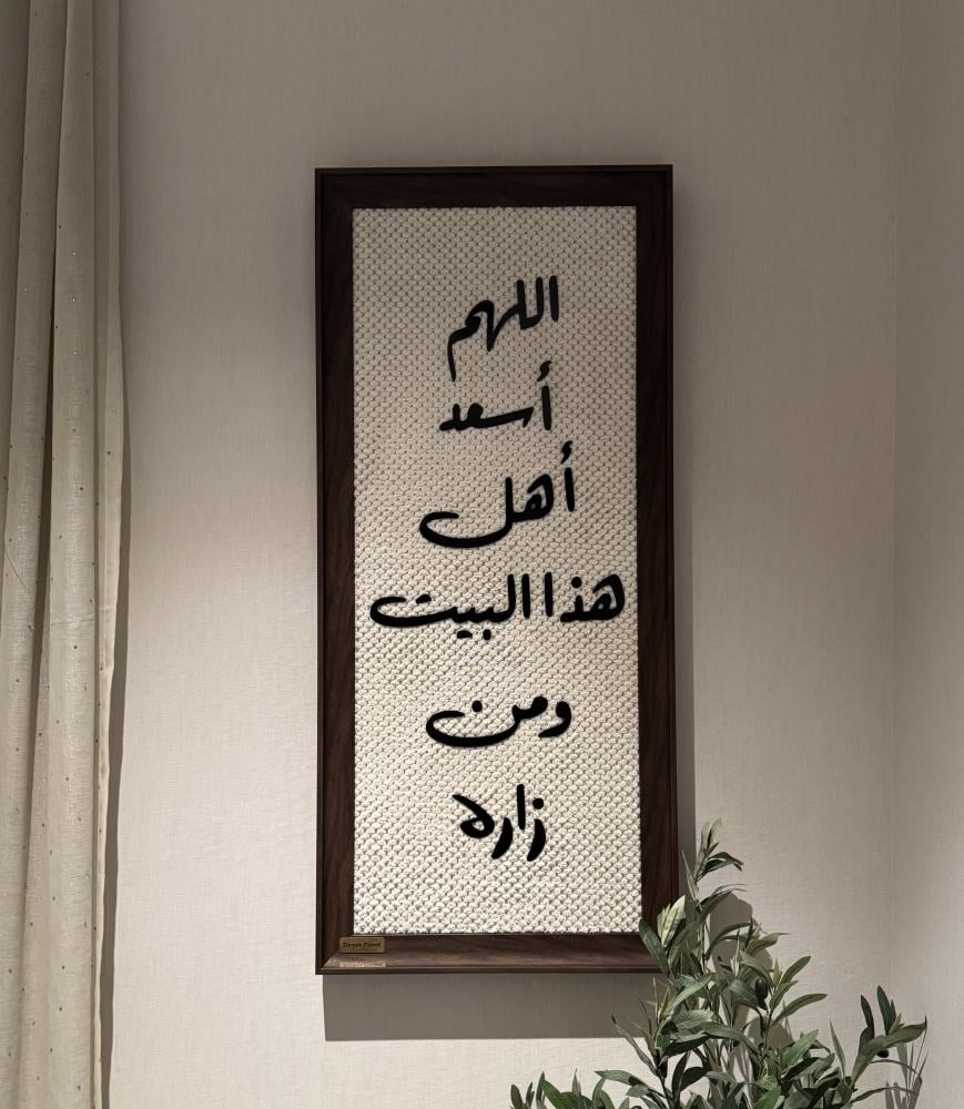 لوحة جدارية أنيقة بعبارة دعائية جميلة “اللهم أسعد أهل هذا البيت ومن زاره”، مصممة بخط عربي بارز باللون الأسود على خلفية نسيجية فاخرة ذات ملمس أنيق، مؤطرة بإطار خشبي داكن يضفي عليها لمسة دفء وفخامة.