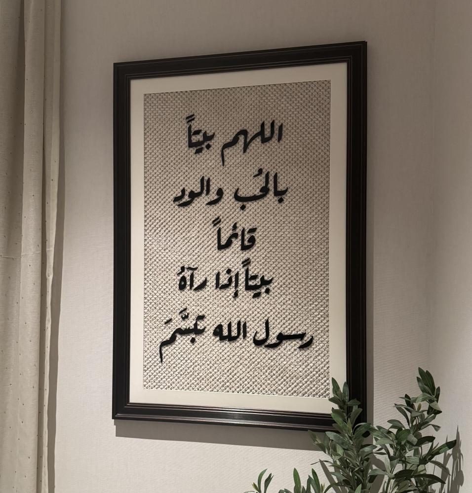 برواز بني غامق يبرز دفء التفاصيل، وخلفية قماش بيج تنسجم بانسيابية مع الأكريليك الأسود الذي يضيف حضورًا قويًا وعصريًا.